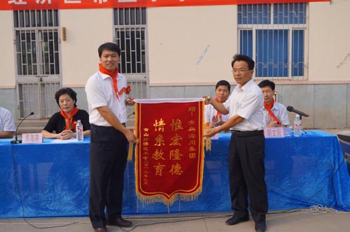 9月20日下午,秋高氣爽、陽光明媚,膠南市黃山經(jīng)濟(jì)區(qū)希望小學(xué)落成儀式在學(xué)校大操場隆重舉行。激昂的國歌聲后,少先隊(duì)員們?yōu)槌鱿I(lǐng)導(dǎo)敬獻(xiàn)紅領(lǐng)巾,以此來表達(dá)孩子們的崇高敬意。一位學(xué)生代表用稚嫩的童音道出了對青島海川建設(shè)集團(tuán)及支持希望工程事業(yè)建設(shè)的各類愛心團(tuán)體的誠摯感謝,和臺下上千名含苞待放,映襯在陽光里的一張張幸福笑臉一樣,他們都是祖國的未來和希望,也讓在場的每一位成年人對“捐資助教、功德無量”這句話有了更深刻的理解和感悟。黃山經(jīng)濟(jì)區(qū)希望小學(xué)校長懷著激動地心情向海川集團(tuán)贈送錦旗一面,愛心助學(xué)的善舉也贏得了在場師生一次又一次熱烈的掌聲。集團(tuán)黃中坡副總裁代表發(fā)言,他特別指出,今年恰逢集團(tuán)成立60周年之際,本著“節(jié)儉辦大慶”和“注重社會公益性”的宗旨,集團(tuán)將主要活動資金拿出來援建黃山經(jīng)濟(jì)區(qū)中心小學(xué),另外發(fā)動企業(yè)職工向老一輩建筑人曾經(jīng)援建過的四川藏族甘孜地區(qū)捐獻(xiàn)衣物。通過一系列與社會接軌的主題活動,力爭將本次大慶辦得更有意義。最后他衷心希望膠南市黃山經(jīng)濟(jì)區(qū)中心小學(xué)的全體同學(xué)從小樹立遠(yuǎn)大目標(biāo),刻苦學(xué)習(xí),努力向上,爭做國家棟梁之才,立志回饋社會,報(bào)效祖國。青島團(tuán)市委副書記張海軍和膠南市委副書記佟海燕也出席儀式并與海川集團(tuán)黃中坡副總裁一起為希望小學(xué)揭牌,同時(shí)就海川集團(tuán)對教育公益事業(yè)的傾情參與和大力支持給予了充分肯定和高度評價(jià)。