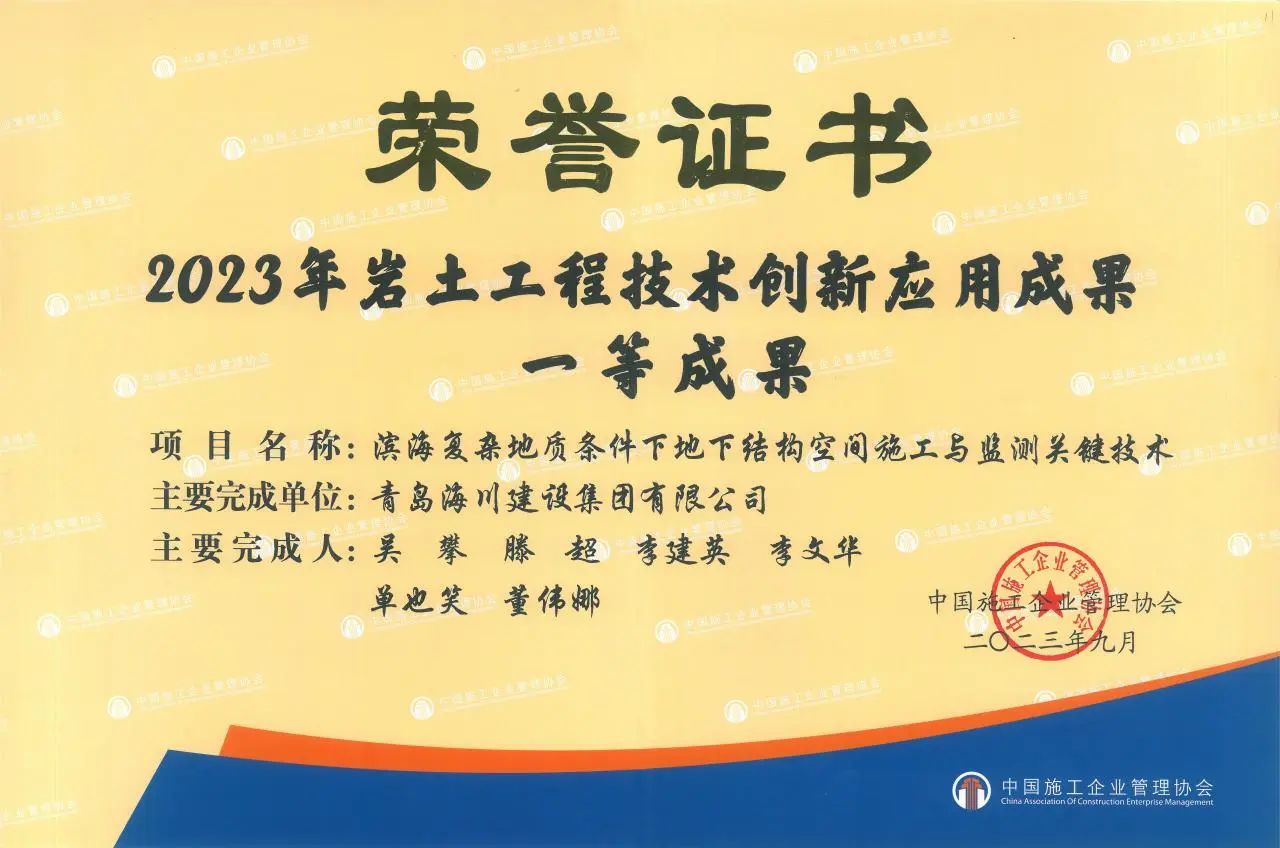 創(chuàng)新賦能 科技爭先 | 青島海川建設集團榮獲多項科技成果獎勵2023-10-08近日,中國施工企業(yè)管理協會公布了2023年度巖土工程技術創(chuàng)新應用成果的通知,青島海川建設集團研究課題《濱海復雜地質條件下地下結構空間施工與監(jiān)測關鍵技術》榮獲一等成果,該成果為集團公司首次獲此殊榮,也是本年度青島市唯一一等獎獲獎獎項。近年來,海川建設始終堅持以科技為本,以... -