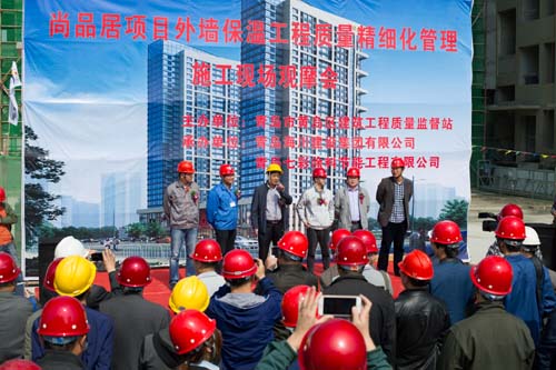 觀摩會當(dāng)天,集團副總裁馬志驍、七分公司總經(jīng)理朱超等陪同黃島區(qū)質(zhì)監(jiān)站領(lǐng)導(dǎo)進行了現(xiàn)場觀摩,上午9:00黃島區(qū)質(zhì)監(jiān)站領(lǐng)導(dǎo)主持了現(xiàn)場觀摩會,對照實體樣板詳細(xì)講解保溫工程各工序質(zhì)量保證要點。主要就工程實體保溫工程界面劑噴涂、玻纖網(wǎng)粘貼、加強層粘貼、窗洞口巖棉套割、錨栓固定等施工工藝進行了講解并宣布現(xiàn)場觀摩開始。黃島區(qū)各與會單位人員現(xiàn)場觀摩了實體工序樣板,各單位間相互切磋工藝做法,交流標(biāo)準(zhǔn)化管理經(jīng)驗。上午11:00觀摩人員陸續(xù)離開施工現(xiàn)場,現(xiàn)場觀摩會圓滿結(jié)束。